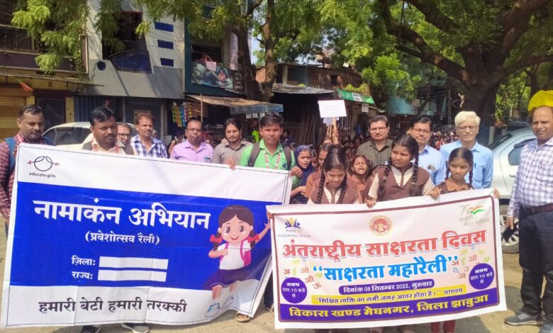 मेघनगर!(रीतिक शर्मा/जयेश झामर) अंतर्राष्ट्रीय साक्षरता दिवस के अवसर पर रोटरी क्लब अपना मेघनगर एवं प्रशासन के साथ मिलकर साक्षरता महा रेली निकाली रेली में मेघनगर के तहसीलदार रवींद्र चौहान साहब बीईओजीएस देवहरे रोटरी क्लब अपना के अध्यक्ष हितेंद्र खातेड़िया सचिव मयंक राका भारत मिस्त्री गोविन्द सिंह महेंद्र सिंह सोलंकी बा. उत्कृष्ट विद्यालय के प्रचार्य नारायण सिंह नायक गुलाब सिंह खदेड़ा एवं स्कूल के बच्चो के साथ महा रेली रूप में 100% साक्षरता का संदेश लेकर निकले