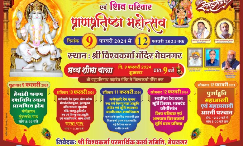 9 फरवरी से मेघनगर मे भगवान विश्वकर्मा के भव्य मंदिर की प्रतिष्ठा का आयोजन होगा