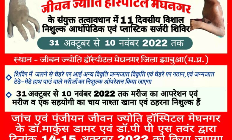 प्रतिवर्ष हो रहे सफल प्लास्टिक सर्जरी शिविर को कोरोना महामारी के कारण पिछले दो वर्षो से स्थगित किया गया था वर्ष 2022 मे पुनः चौथा सफल प्लास्टिक सर्जरी शिविर का आयोजन रोटरी क्लब अपना एवं जीवन ज्योती होस्पिटल मेघनगर के संयुक्त तत्वावधान में चतुर्थ विशाल नि:शुल्क 11 दिवसीय आर्थोपेडिक एवं प्लास्टिक सर्जरी शिविर जो 31 अक्टूबर से 10 नवंबर 2022 तक चलेगा रोटरी क्लब अपना मेघनगर के शिविर संयोजक भरत मिस्त्री ने बताया की इस शिविर में जर्मन के डॉक्टर अपनी सेवाएं देंगे इस शिविर में छोटी या बड़ी सभी सर्जरी नि:शुल्क होगी यह शिविर नगर के समाजसेवी व नगरवासियों के सहयोग से आयोजित होगा जीवन ज्योति हॉस्पिटल के संचालक फादर पीए थोमस ने बताया की इस शिविर मे जिन किसी मरीजों को सर्जरी करवाना है वे दिनांक 14-15 अक्टूबर को हमारे डॉ.मार्कुस डामर एवं डॉ टीपी एस तवंर से जांच करवा कर पंजियन करवाएं पहले 100 एवं यही पंजियन मान्य होगा रोटरी क्लब अपना के अध्यक्ष डॉ हितेंद्र खेतेड़िया एवं सचिव मंयंक रांका ने जानकारी दी की इस शिविर में मरीज एवं एक सहयोगी का खाना चाय-नाश्ता एवं ठहरने की संस्था कि ओर से नि:शुल्क रहेगी