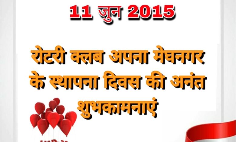 मेघनगर! 11 जून 2015 को रोटरी क्लब अपना मेघनगर की स्थापना हुई थी रोटरी क्लब अपना के गठन को 8 वर्ष पूर्ण हुए 9 वें वर्ष में प्रवेश हुआ है क्लब के सस्थापक भरत मिस्त्री ने बताया इन 8 वर्षों आप सभी के सहयोग से रोटेरियन साथियों की मेहनत से नगर को स्वास्थ्य शिक्षा एवं मनोरंजन जैसी अनगिनत सेवाएं दी है जो आप सभी को भी विदित हैं विशेषकर स्वास्थ्य के क्षेत्र में सबसे अधिक सेवाएं नगर के सभी लोगो को मिल रही हैं यह आप सभी का सहयोग और रोटेरियन साथियों की मेहनत से संभव हुआ