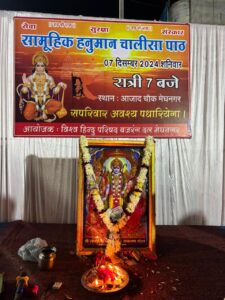 विश्व हिन्दु परिषद बजरंग दल ने बैनर तले सेकड़ो युवा भक्तजनो ने सामूहिक हनुमान चालीसा का पाठ किया करीब एक घंटा चलने के पश्चात समापन पर आरती कर के प्रसादी वितरण किया विश्व हिन्दु परिषद बजरंग दल से जुड़े अल्पेश जाटव ने बताया की प्रत्येक मंगलवार शहर के प्रमुख स्थानो पर सामूहिक हनुमान चालीसा का पाठ किये जाएंगे शंकर मंदिर पर 8:00 बजे हनुमान चालीसा का किया जाएगा ।सभी से आव्हान किया अधिक से अधिक संख्या मे आये